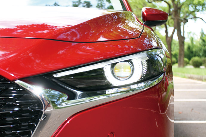 以Kodo魂動為設計語彙的Mazda 3採日式簡約風格貫穿整台車,在第四代中更以單一的律動曲線創造出光影的變化,在不同角度中仍然能夠感受到整台車優雅的氣勢,並且相當俐落的線條也讓Mazda 3成為一台獨特外型的豪華車款,不僅在競爭激烈的車市中讓人為之一亮,也像是一台動態藝術精品行走在路上。於車頭的網狀水箱護罩,也從單一線條的車身跳脫出來,而在這一次加大了比例後顯得更加奢華,搭配著引擎蓋的兩道線條更顯得霸氣與優雅的融會,再加上一雙銳利小比例的LED頭燈,讓車頭達到完美的線條比例,增加了整體輪廓上的美感。至車尾也同樣以小比例的LED尾燈,搭配上更為突出的駝峰輪廓跳脫出整體線條,讓外觀在簡約中帶出多處細緻的設計,猶如藝術精品一般,讓人從各種角度都能從簡約中發現讓人驚豔的美感。