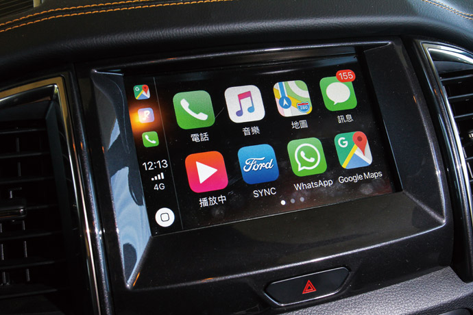 車室內雖然是以黑色元素為基底,但是運用上了真皮、鋼琴鏡面烤漆,搭配橘色縫線做為整體車內氛圍的鋪陳,再加上皮椅布面交織而成的質感座椅,展現出Ranger不凡的車室質感,除此之外,中控搭載8吋高解析度觸控螢幕,整合了SYNC 3娛樂通訊整合系統,提供更直覺、更快速的語音辨識與觸控能力,並同時支援Apple CarPlay及Android Auto,為車主創造更豐富而便利的車內連結體驗,車主只需使用支援Apple CarPlay的iPhone 手機,並以傳輸線連結車內USB插槽,即可透過Siri聲控操作訊息、電話功能、Apple Maps、Google Maps以及部分由第三方所開發的智慧型手機程式如Spotify,同時,使用者可輕鬆指觸拖曳縮放、滑動頁面及點選所需的功能,享受如同智慧型手機般的靈敏及便利的操作體驗;此外,駕駛者除了透過手機連結Google Maps的功能之外,原廠主機也提供內建的導航系統,使用上也相當的便利就手。至於在駕駛介面上,方向盤採用真皮包覆的材質,並與橘色縫線相匹配,提供給駕駛相當優異的握感之外,方向盤左右側的設定按鍵,可分別調整儀表板兩邊4.2吋螢幕設定,同時在方向盤的下方按鍵,設有ACC跟車系統,讓Ranger展現從容恣意的駕馭樂趣。