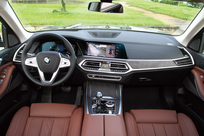 在全新4-Series推出之前,X7擁有品牌最大的雙腎型水箱護罩,且在注入了全車Design Pure Excellence套件點綴下,擁有質感出眾的外貌,進氣壩鍍鉻飾條、前後銀色下護板、緞面鋁質窗框以及鋁質車頂架皆包含在套件其中。而在輪圈方面原廠直接標配了22吋多輻式樣式,配上5151×2000×1805mm的碩大車身尺碼,可說是搭配的恰如其分;最後在車尾方面,行李廂門配備了上下對開電動啟閉系統,打開後裡頭擁有326公升的標準行李廂裝載容積,如將第二及第三排座椅透過電動傾倒後,最大可擴充至驚人的2120公升。