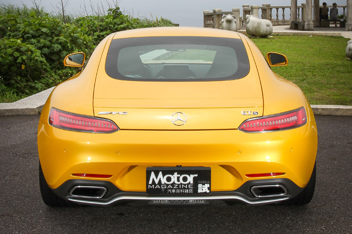 極短前懸搭配極長引擎蓋之後,AMG GT S更將座艙偏向後軸處,不僅成就了優異的前後47:53的車身配重,也造就了最迷人的掀背式車尾線條。以水平為主的車尾線條幾何,從上而下分別為LED尾燈、整合排氣管於其中的後保桿、內藏中置式LED倒車燈與後霧燈的下擾流等。