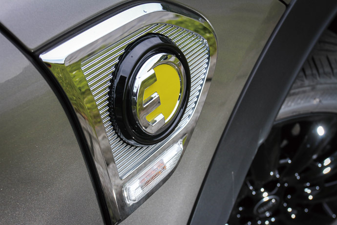 首度亮相的MINI Cooper S E Countryman ALL4,承襲Countryman的經典元素,包括渾圓頭燈設計,外圍包裹著鍍鉻飾條的點綴,輔以遠近光雙功能LED頭燈,並搭載轉向輔助科技,傳承經典之餘,更提供優異的照明機能,除此之外,水箱護罩造型也採用雙層式設計,以鍍鉻飾條輔以蜂巢網狀點綴而成,而水箱護罩中的S字樣,也由一般版本的紅色,改為油電版本專屬的黃色徽式; 當然,車頭辨識度是MINI品牌的靈魂所在,在車側更加入了U形線條,讓Countryman富有強烈的肌肉感造型,並在左右前葉子板上放入了黃色E的油電專屬飾版,構築成Cooper S E Countryman ALL4的視覺印象;不過在車側最重要的象徵還是經典的懸浮式車頂,並以雙色烤漆塗層展現其經典特色,使得Countryman至車側看去就像戴著帽子似的吸引眾人目光。